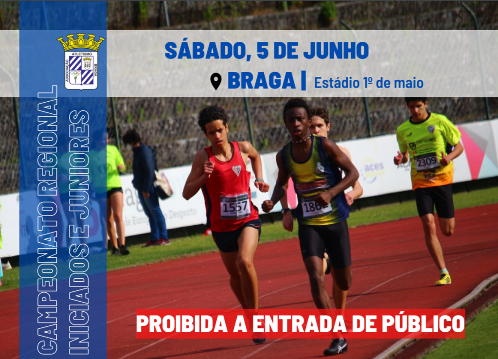 para consulta listagens atletas inscritos Campeonato Regional de Iniciados Juniores Associação Atletismo Braga competição está marcada para próximo sábado junho Pista Atletismo Estádio Maio Braga Face número inscrições programa horário